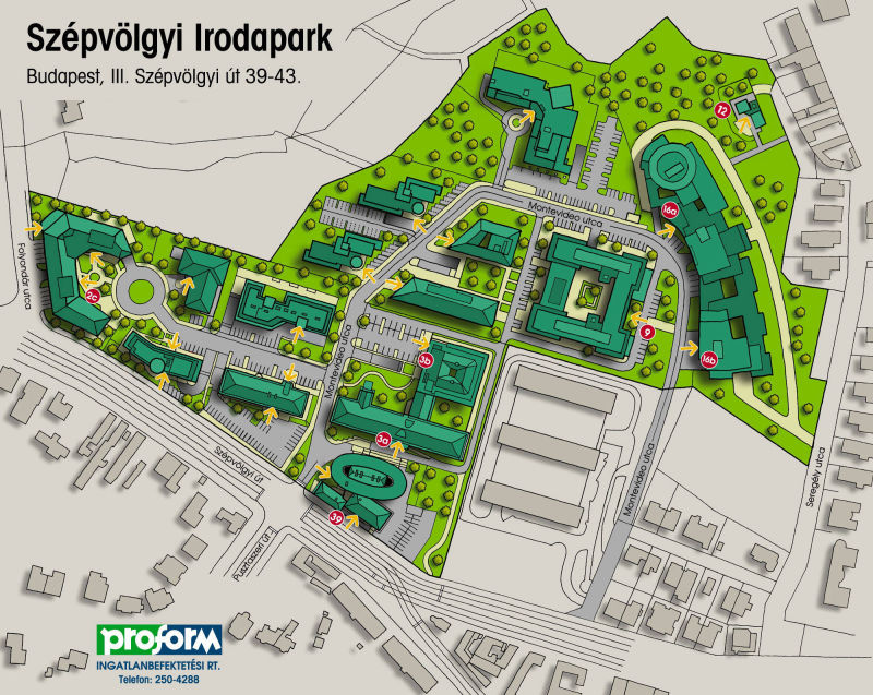 A Szépvölgyi Irodapark a III. kerület szívében, a Rózsadomb lábánál épült közel 6 hektár nagyságú területen, mely lehetővé teszi, hogy leendő és meglévő Bérlőinknek elegáns, nagy zöldterületekkel rendelkező környezetben biztosítsunk irodaterületet.